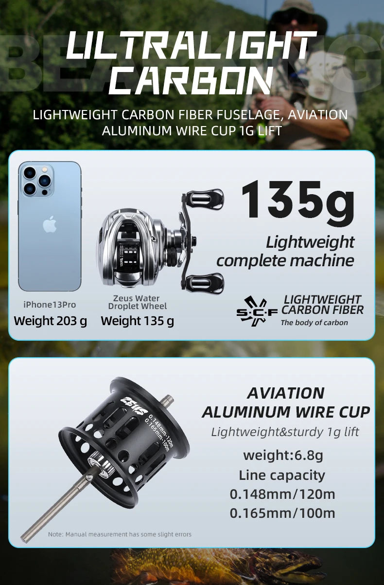 Introducing the BEARKING Brand New Zeus Series 9BB 135g Light Drag System 4kg Max Power Carbon Fiber 7.1:1 High Speed Ratio Baitcasting Reel. This top-of-the-line fishing reel is a must-have for any avid angler. With its sleek and stylish design, it is sure to catch the eye of anyone who sees it.Crafted with precision and quality, this reel boasts a powerful 7.1:1 gear ratio and 8+1 stainless steel bearings for smooth and efficient casting. The drag system can handle up to 4kg of weight, making it perfect for reeling in those big catches. And with its lightweight carbon fiber construction, you can fish for hours without feeling weighed down.But it's not just about power, this reel also features advanced technology for a more enjoyable fishing experience. The ultra-thin body design and CNC machined aluminum spool make it easy to handle and perfect for long-term use. The upgraded asymmetrical rotor design provides a stronger and more lightweight rotor, while the micro click drag setting allows for precise and powerful drag performance.Other features include a dual main ball bearings structure, durable alloy line guide, and optimized winding system for smoother casting. And with the added bonus of a waterproof and dustproof shields drag knob, this reel is built to withstand any fishing conditions.Included in the package is the fishing reel, instructions, and a convenient bag for storage. So why wait? Upgrade your fishing gear with the BEARKING Brand New Zeus Series Baitcasting Reel and experience the ultimate in performance and style.