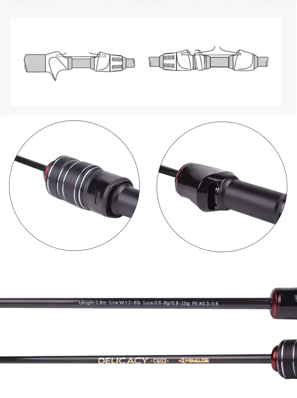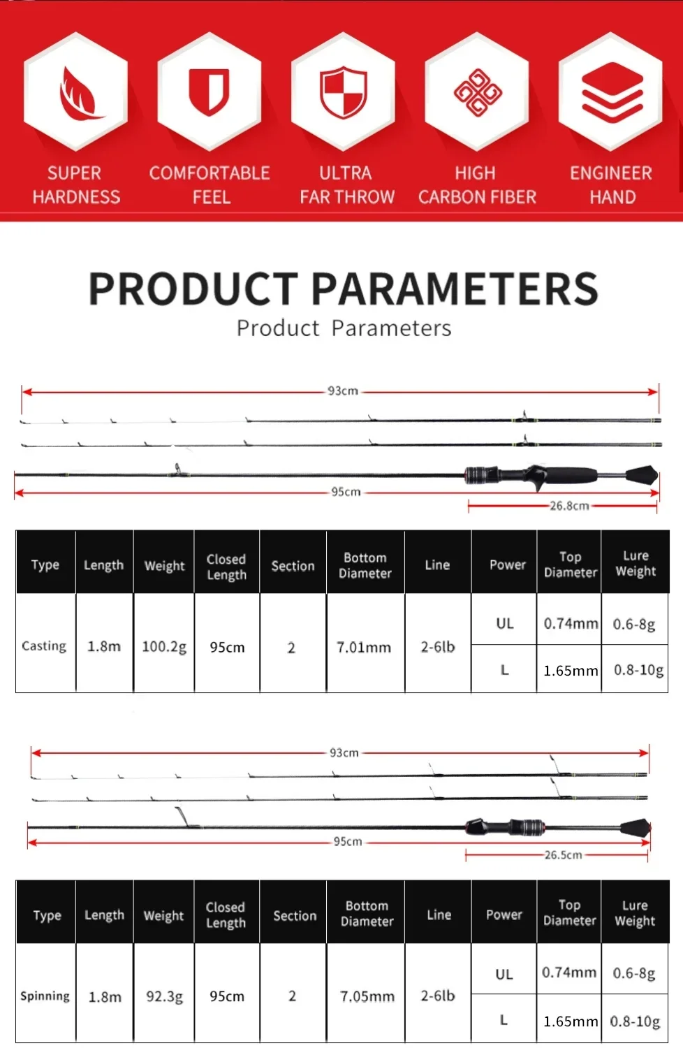 Legnth: 1.8m|Closed Length: 95cm|Weight: 100.2g|Lure Weight (Hollow/Solid): 0.8-10g/0.6-8g|Line Weight: 2-6lb|Action (Hollow/Soild): Fast / Slow|Power (Hollow/Soild): L/UL|Tips: Hollow + Solid 2 tips|Bottom Diameter : 7.01mm|Top Diameter (Hollow/Soild): 1.65mm/0.74mm|Section: 2|