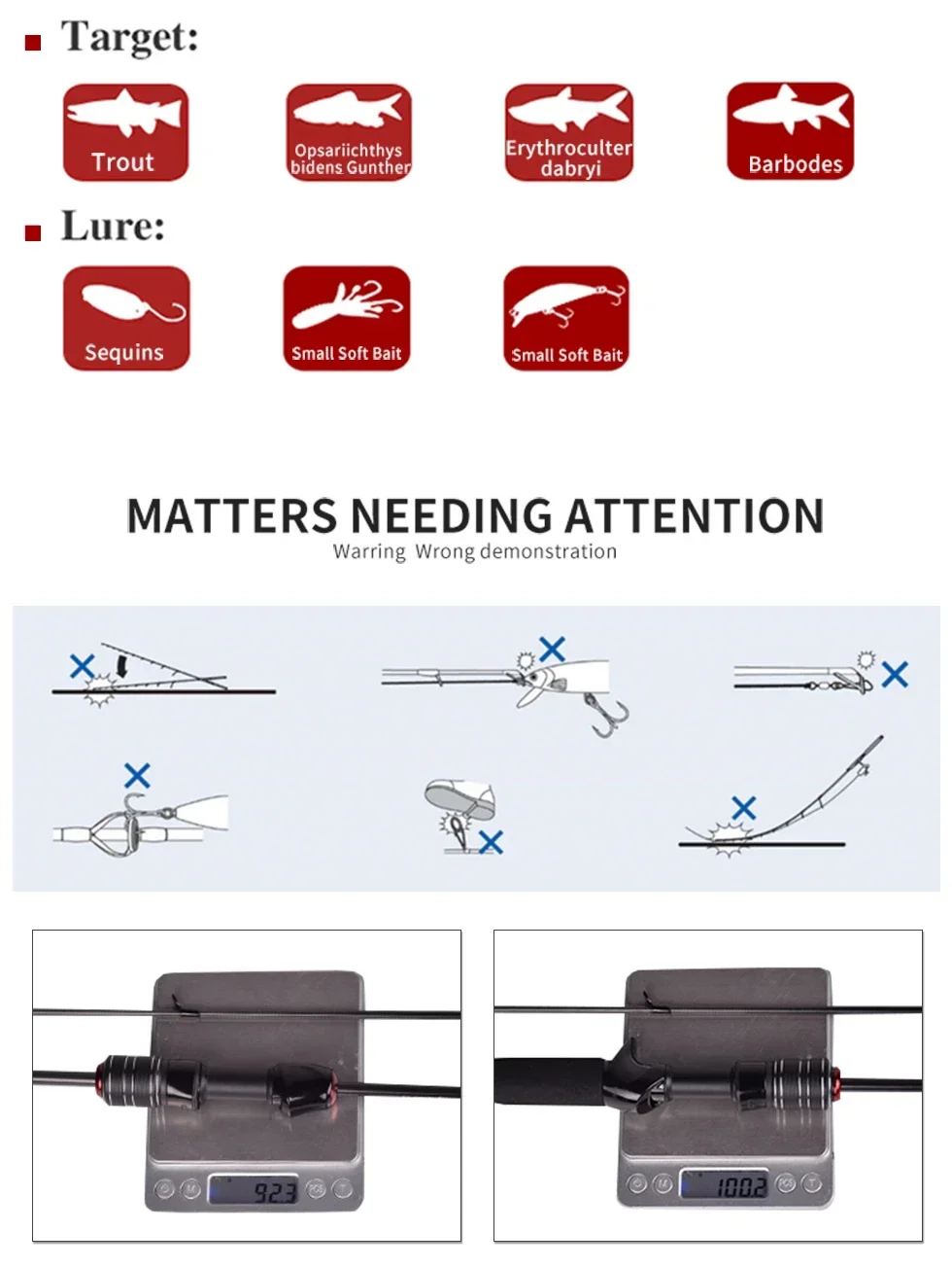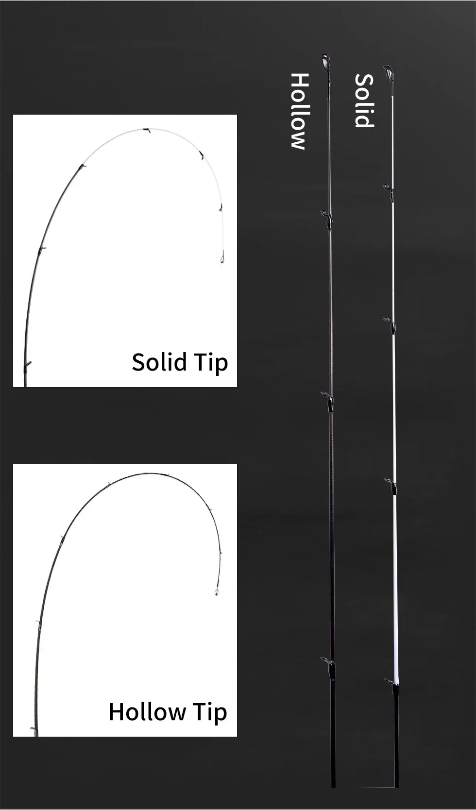 Hollow and Solid Tips-This rod is equipped with one hollow and one solid tip, a totally 2 tips. The lure weight is 0.6-8g / 0.8-10g, wider applicability.